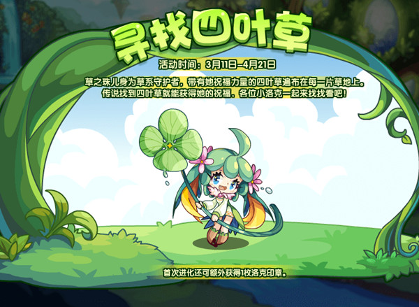 草之珠儿身为草系守护者,带有她祝福力量的四叶草遍布在每一片草地上。传说找到四叶草就能获得她的祝福,各位小洛克一起来找找看吧!
