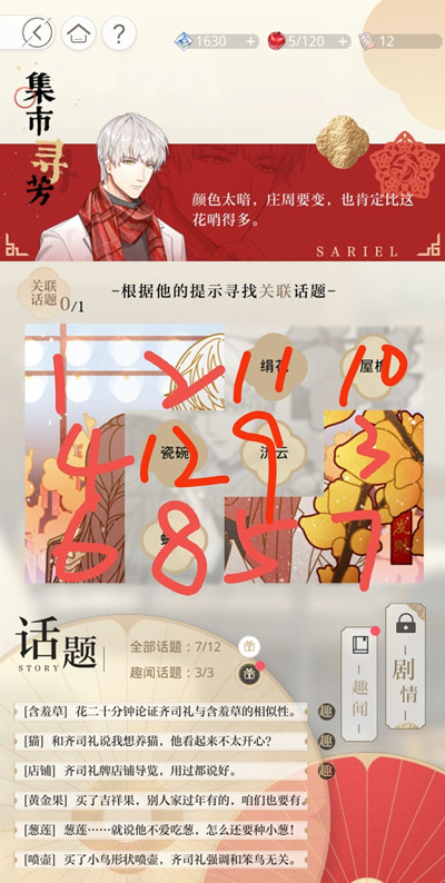 集市寻芳这一关的话题顺序按照图中标记出的顺序就可以了。