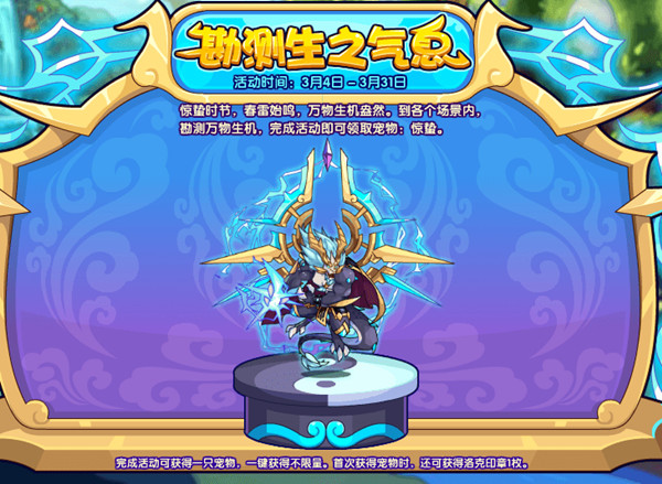 惊蛰时节,春雷始鸣,万物生机盎然。到各个场景内,勘测万物生机,完成活动即可领取宠物:惊蛰。