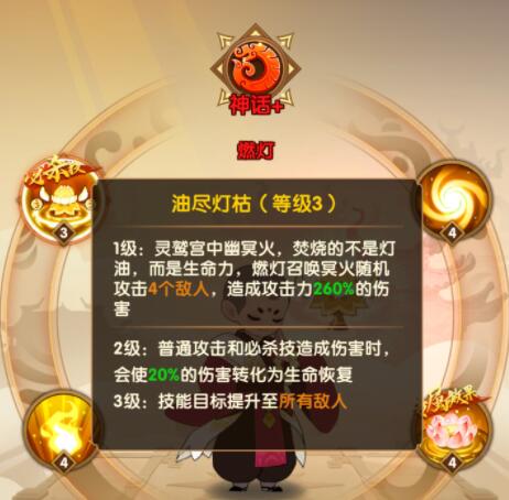 油尽灯枯:能够将冥火召唤出来攻击敌人,该技能可以攻击四名敌方单位,对敌人产生百分之两百六十的攻击效果,我们的攻击以及大招都可以对敌人形成攻击效果,还有百分之二十的威力会形成血量给自己加成,满级技能可以攻击**敌人。