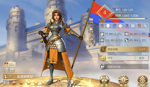 法国阵营:开局英雄为贞德,自带技能是主动技,对敌方单体发动1次战术攻击,并有概率额外发动1次战术攻击。