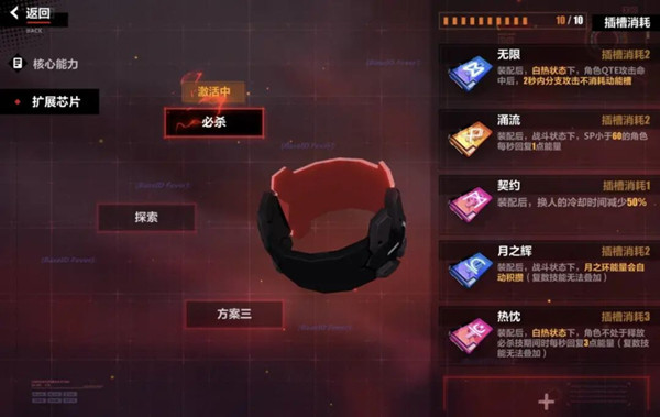 通过合理搭配芯片,可以实现不同的玩法流程,例如搭配一些SP回复芯片,让角色更快开出大招,这里插槽上限以及扩展芯片也可以通过任务获取。