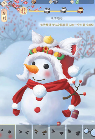 活动期间,大侠每日登录都可以解锁一个雪人的装扮部位;雪人一共有七个部位可以装扮,每个部位都有多种装扮风格可供选择,可以打造一个你喜欢的个性雪人。