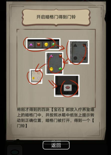 将得到的四块[宝石J都放入疗养室墙上的暗格门中,并按照冰箱中纸张上提示转动到正确位置,暗格门被打开,得到一个[门铃]