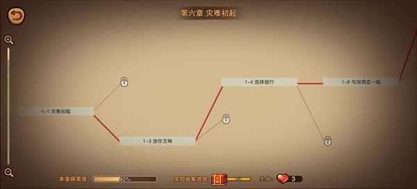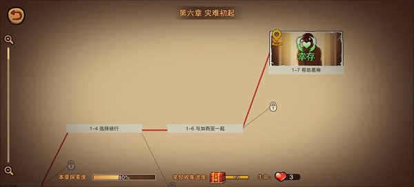 1、第六章灾难初起故事通关线路:1-1灾难初起—1-3放任艾琳—1-4选择绕行—1-6与加西亚一起—1-7帮助葛琳