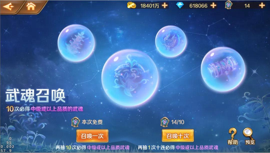新开放的武魂抽卡系统,消耗“武魂召唤令”获取武魂或武魂碎片。每天有一次免费抽卡的机会。