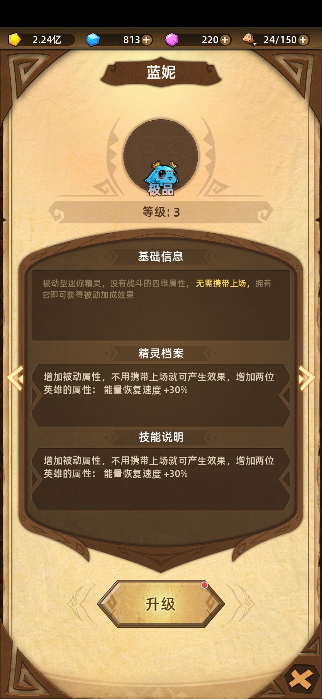 秘境**层,迷你精灵蓝妮,效果是增加回蓝效率可升级提升,马马虎虎的效果,但是迷你精灵可以挖矿,挖矿可是钻石的一大免费来源,因此大家还是能拿尽量拿。