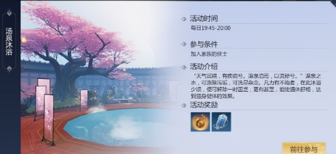 活动详情:活动期间玩家可以通过参与汤泉沐浴玩法,获得大量的经验奖励。此外还通过购买对应的素材来提升经验的获取倍率。