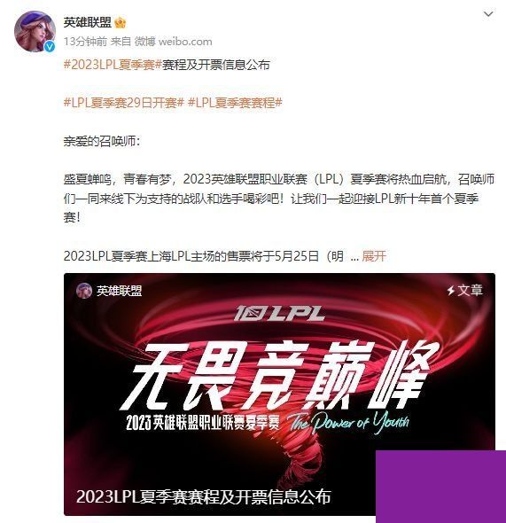2023lpl夏季赛开赛时间表:2023LPL夏季赛上海LPL主场的售票将于5月25日(明日)14:00开启5月29日至6月4日门票售卖。此后每周周一14:00固定开启下周一至下周日的门票售卖。每个比赛日的门票售卖在比赛开始前的1小时停止售卖。