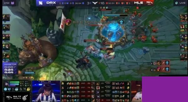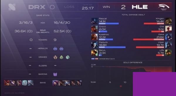 第二局双方平稳**,Viper厄斐琉斯下路一打二先送一波,但是Clid盲僧和Life泰坦野辅先锋团站出来了!Viper厄斐琉斯一波狂风向前的坠明清辉夜凝定住四个帮助队伍拿下优势!随后的野区交锋HLE利用上中下三人分批绕后再次获胜,两波团就确立了8K的经济优势!随后的比赛DRX背水一战开Viper厄斐琉斯失败,Life泰坦冲泉和Paduck金克丝一换一之后,HLE横扫DRX,拿下首胜的同时送给对手三连败!