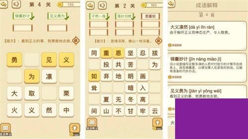 《成语消消乐》是一款**休闲的益智类闯关游戏。游戏的玩法非常简单,只需要用手指在屏幕上按顺序点击可以拼写的成语即可**。当**的成语越多,获得的金币也就越高。游戏设有时间限制,所以玩家需要尽快找到相同的成语来**。当玩家遇到困难可以点击提示来帮助自己通关。