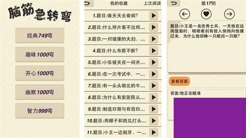 《脑筋急转弯大全》是一款富有挑战性和趣味性的问答游戏。游戏中不仅可以锻炼玩家的智力和思维能力,还可以带给玩家**和**。本游戏共收录了大量的脑筋急转弯题目,玩家需要跳出固有的思维才能成功通关,各种幽默有趣的脑筋急转弯题目,能让玩家锻炼思维和智力,还可以带给玩家**。