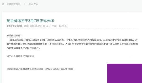 由于使用此地图的玩家太少,该地图已于2016年2月22日(国服版本为2016年3月7日15:00)**移除,为了回馈那些曾经热爱过这个地图的玩家,拳头公司决定将向所有在前四年间(国服则为2016年2月19日之前)使用过该地图超过100局(人机与自定义对战除外)且在2015年2月18日—2016年2月18日之间QQ号下所有召唤师角色都没有因恶劣或违规行为被处以封号一年及以上处罚(国服)的玩家发放战场统治者头像。