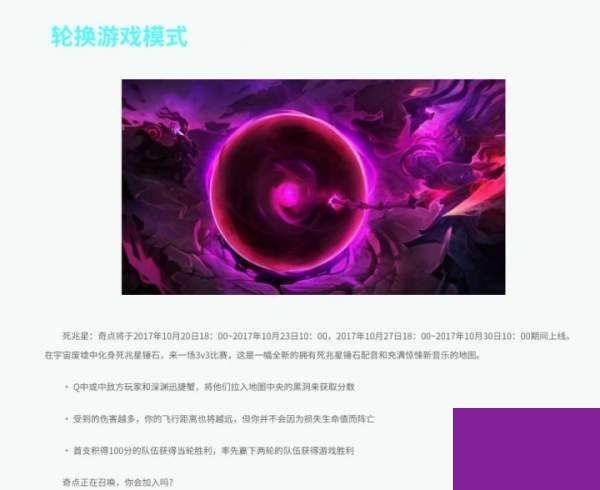 简单来说玩法就是:六个自带死兆星皮肤的锤石技能勾来勾去,再利用一些其他道具或者技能,把敌人推进地图中间的黑洞就可以得分,先攒够300分的赢。