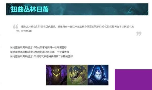 **,在2023年末正式退役,国服9.23版本,官方还用了“扭曲丛林日落”的标题来形容,一直以来在丛林中玩耍的玩家们将获得奖励: