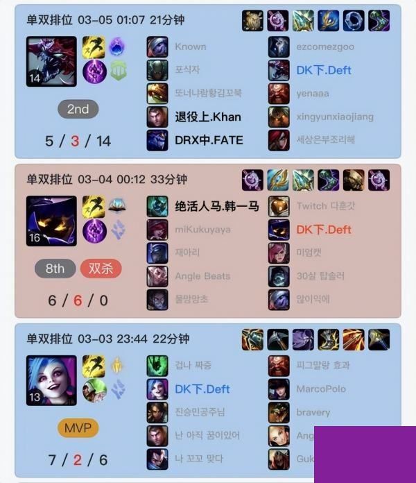 根据OPGG上的韩服高分段数据,小法已经成为了T1级别的AD,54.8%的胜率更是一骑绝尘。这套兴起于路人局的打法当前已经得到了职业哥的认可,Deft、小吕布、Aiming、LP、huanfeng都有练习记录。