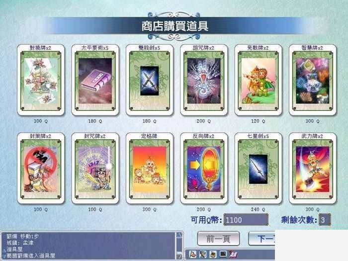 依照掷骰子的点数决定前进格数,每到一个地点都有机会发生有趣的特殊事件,可能获得或失去**、物品牌,也有可能前进、后退、直达。同时,其他玩家也可以在格子上驻军或建设,遇到他国的建设,就必须付过路费,如果遇上驻军,就必须派出三位武将跟对方作战,以三战两胜的方式决定胜负,胜者得钱、输者赔款。
