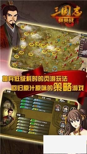 三国志群英战游戏是****款真实融合对策 即时战斗的三国游戏,撇开低级耗时的网页游戏玩法,重归原生态的策略类游戏,让你具有决胜千里运筹帷幄的深谋远虑,又有竞技场过万军当中取敌头颅的**。