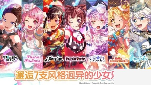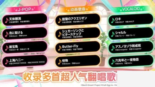 游戏内所有歌曲的创作和改编均由日本**音乐制作团队Elements Garden操刀完成。除了《BanG Dream!》企划已发行的**歌曲之外,游戏还收录了大量全新原创曲,以及玩家们耳熟能详的ACG经典曲目翻唱版,如《魂のルフラン》、《Butter-Fly》、《secret base~君がくれたもの~》、《Don’t say “lazy”》等等。