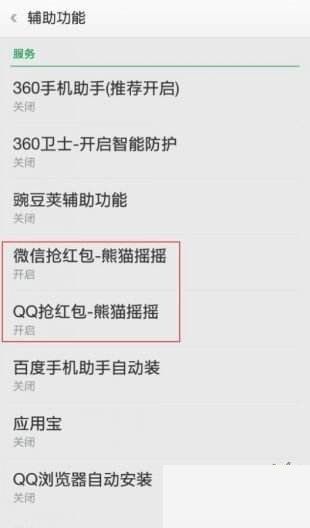 (4)、在辅助功能中打开“微信抢红包-熊猫摇摇”和“QQ抢红包-熊猫摇摇”的服务功能即可。