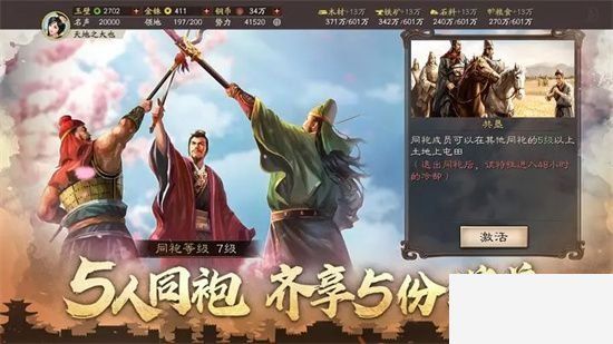 -民心系统:同盟领地民心加成。黄巾、大汉双方阵营根据领地内民心归属状况提供全同盟增益。同盟可以组织玩家讨伐领地内贼寇、攻占城池提高民心归附,解锁飞桥栈道、调动速度提升等民心增益。全民一心,共同抗敌……