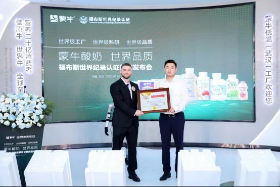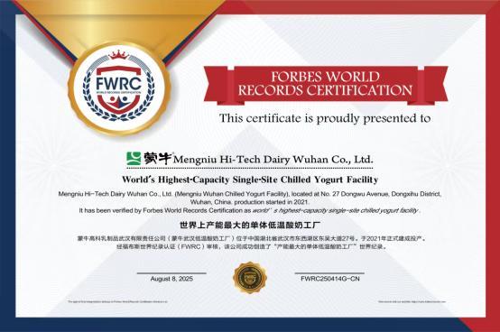 蒙牛低温武汉工厂荣获“FWRC福布斯世界纪录”认证“世界上产能最大的单体低温酸奶工厂”