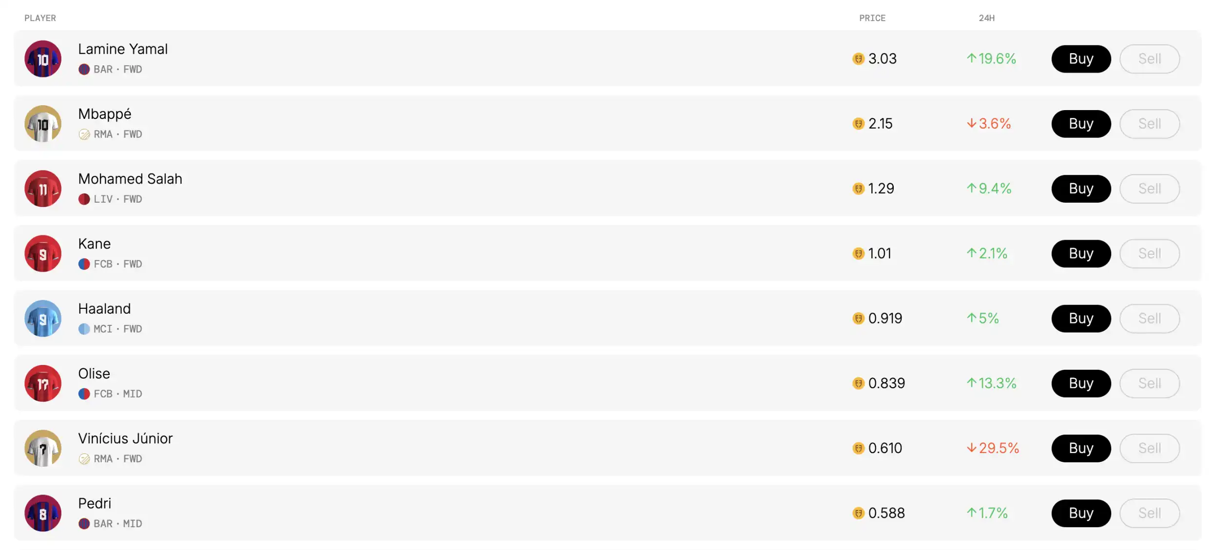 拿到 Gold 后,玩家可前往「交易」页面购买任意在售球员的股份。购买球员时,游戏会显示球员所属球队、位置、年龄、未来赛程和历史表现等信息。每位球员在购买时自带 4 场比赛的合约(即可以参赛 4 轮),合约耗尽后需额外续约才能继续获分。