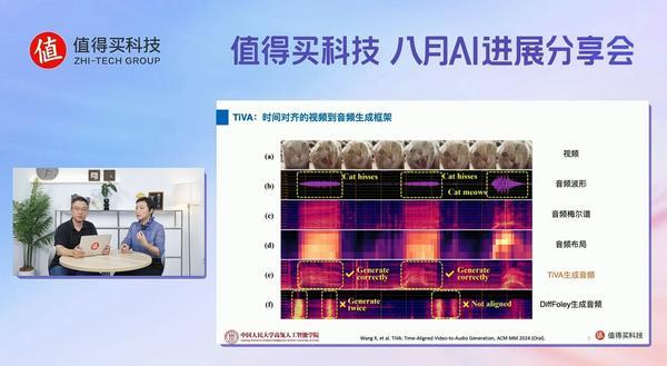 分享会现场,宋睿华教授深入浅出地介绍了与值得买科技合作AI研究课题时发现的两个技术难题:如何为无声视频配音以及如何从图片生成有声视频。在为无声视频配音的工作中,宋睿华教授团队提出了使用低分辨率的梅尔频谱作为“音频布局”,提出一个名叫TiVA的新框架,可以先从视频生成音乐布局再用音乐布局影响**音频的生成,实验结果表明TiVA显著**了学习的难度,提高了音频的质量和它与视频的同步性。此外,宋睿华教授还以实际案例进行了补充,“以往工作只能为动物园里叫了几声的白头鹰视频配上其他小鸟的**,且与张嘴的时机不匹配,TiVA则可以为白头鹰配上与嘴型基本同步的鹰的**。”对此,宋睿华教授梳理了视频到声音的三种框架,并提出一种名为VAFlow的全新框架,用视频先验代替以往方法中采样的高斯噪声,让生成的音频成功率更高,与视频中多个声源更贴合,“我们的创新不止于此,我们还率先提出了从一张图像生成有声视频的问题和新方案JointDiT,无需先生成视频再配音。这种一步到位生成有声视频的场景与谷歌前不久发布的Veo 3形式相似,显然更受用户欢迎。”