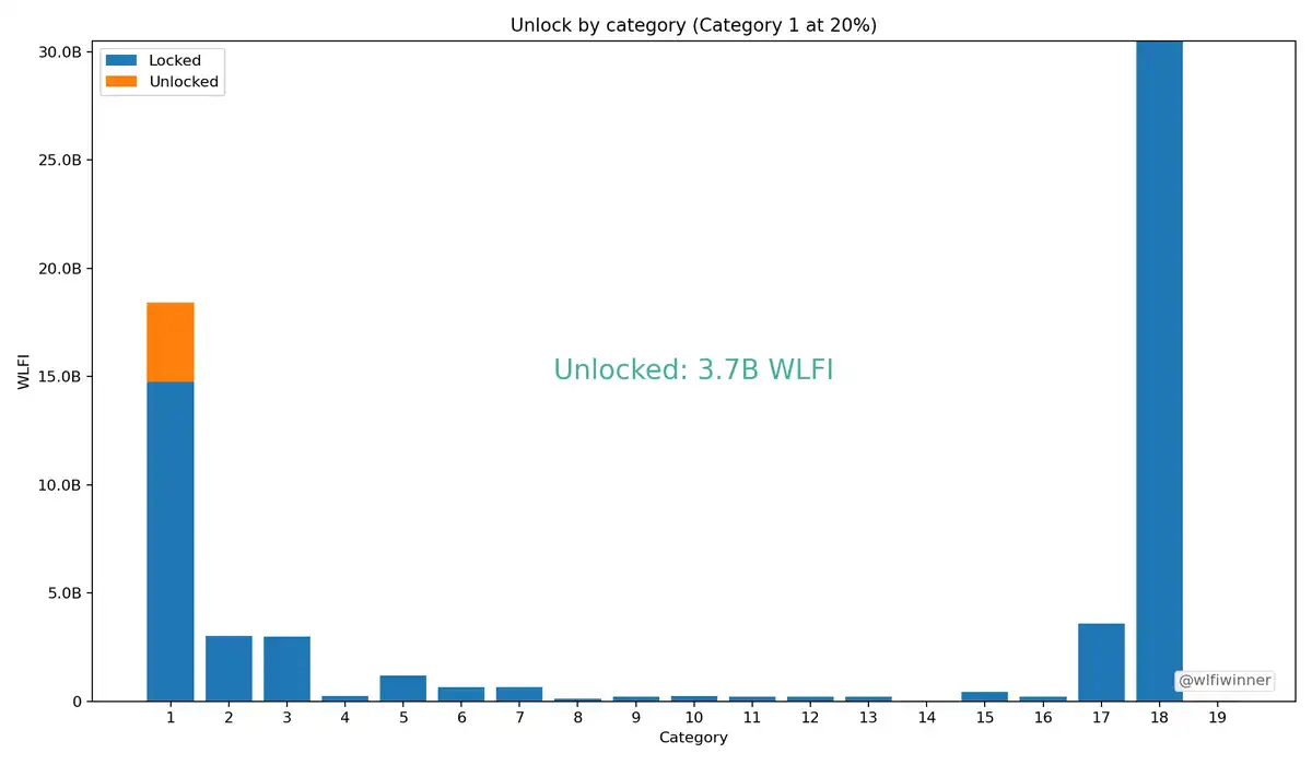 其二则是 WLFI 在 8 月 23 日公布的初始解锁规则——**早期预售用户的**份额将在 WLFI 开盘初始实现解锁。具体而言,每个地址在 0.015 美元和 0.05 美元的轮次中购买的 WLFI 的 20% 将解锁,剩余 80% 的解锁计划仍将由社区通过治理投票决定。创始人、团队、顾问和合伙人的**份额仍处于锁定状态,这些类别均不会包含在初始解锁中。