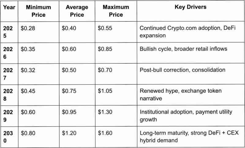 - 2028–2030: 随着Crypto.com持续的营销和DeFi的发展势头,CRO有实现 突破1美元 的现实机会。