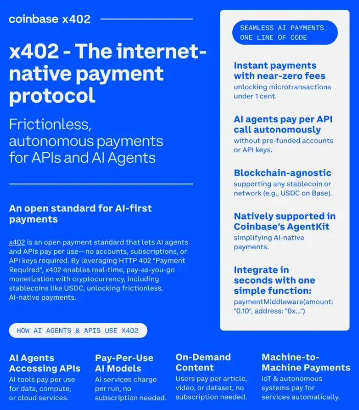 - Coinbase 携以太坊社区推动 x402,让 *API 调用即支付* 成为现实——稳定币原生、A2A(Agent-to-Agent)直连。