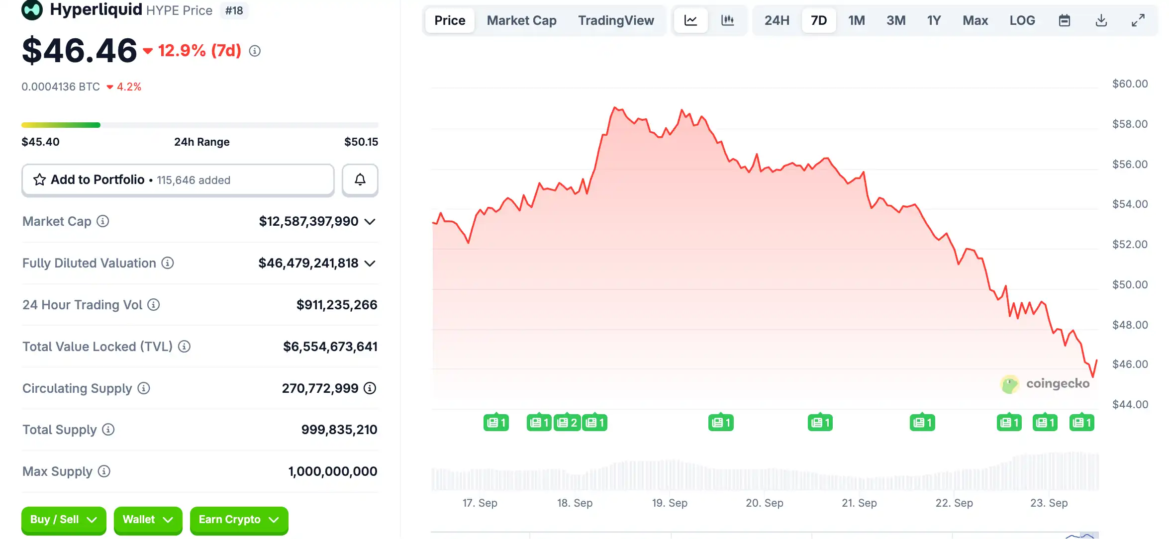 相比之下,Hyperliquid 自周末高点以来已下跌逾 13%,并在今日继续下跌 7.4%,盘中一度触及 47.83 美元。