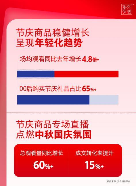 作为中秋国庆档的 “国民级食材”,大闸蟹持续**,成为最吸睛的大爆款,交个朋友间推出多个大闸蟹专场,在间通过溯源展示、现场烹饪、口感评测等互动环节,点燃中秋节庆氛围,场均观看同比去年增长4.8倍。其中,00后在整个节庆礼品购买占比达到65%,年轻人正在通过电商成为节庆消费的主力军。