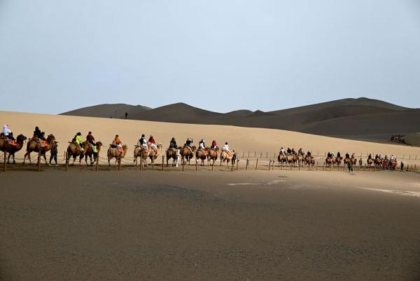 国庆、中秋双节将至,节日氛围日益浓厚,多地景区游客增多,旅游逐渐“升温”。图为9月25日,游客在甘肃省敦煌市鸣沙山月牙泉景区游览。新华社发(张晓亮摄