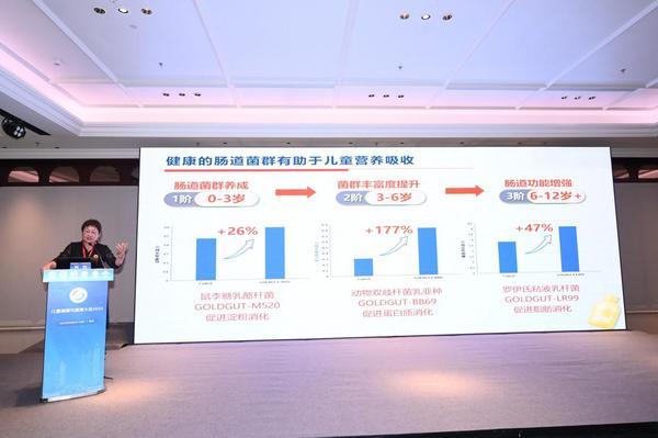 少年儿童健康不仅需要关注骨骼生长的核心营养,肠道健康作为营养吸收与免疫功能的基础,同样是本次大会的热议内容。米杰教授指出,肠道菌群的结构与功能随少年儿童年龄变化而呈现阶段性特征,0-3岁为菌群初步定植期,3-6岁为丰富度提升期,6-12岁及以上则进入功能强化阶段。不同年龄少年儿童的肠道健康管理策略也需有所区分。米教授进一步提到,适当补充如鼠李糖乳酪杆菌GOLDUT-M520、双歧杆菌乳亚种GOLDGUT-BB69、罗伊氏**乳杆菌GOLDGUT-LR99等益生菌菌株,并结合益生元的使用,有助于促进营养物质的消化与吸收。