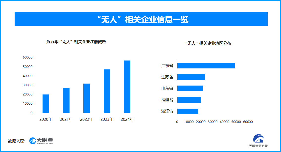 天眼查专业版数据显示,截至目前我国现存在业、存续状态的“无人”相关企业超34.3万家。其中,2025年截至目前新增注册相关企业约8.1万余家,从企业注册数量趋势来看,近五年间,“无人”相关企业的注册数量呈现出逐年增长的态势,并在2024年达到**。