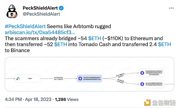 4月18日消息,据派盾预警监测,Arbitrum生态Arbtomb项目疑似Rug Pull,**者已将54枚ETH(约合11万美元)桥接到以太坊,然后将52枚ETH转移到Tornado Cash,并将2.4枚ETH转移到币安。