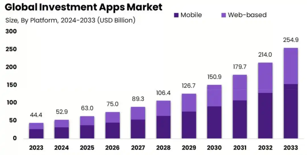 自 2021 年以来,零售交易市场中移动交易应用这一垂直领域持续扩张,其背后是移动设备渗透率的提升和新一代自主决策投资者的崛起。全球投资应用市场规模预计到 2033 年将达到约 2549 亿美元,年复合增长率(CAGR)达 19.1%。
