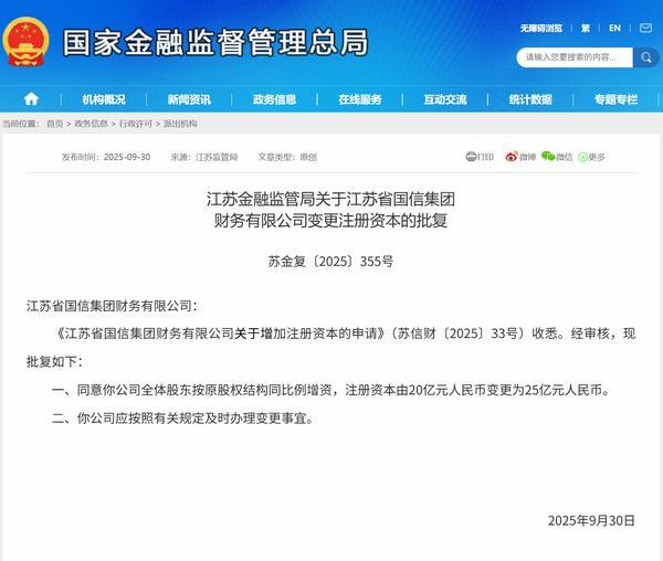 江苏国信财务公司获批增资至25亿元