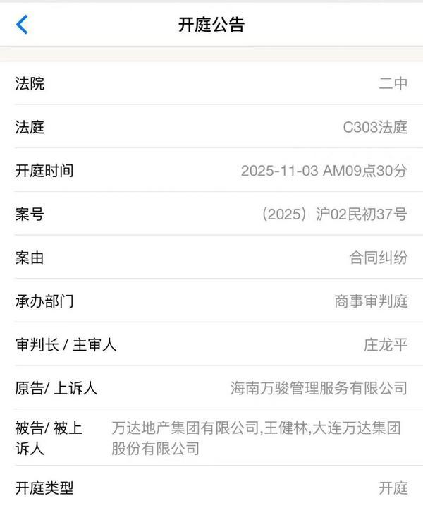 10月15日,据工商资料显示,近日,法院公开海南万骏管理服务有限公司**大连万达集团股份有限公司、万达地产集团有限公司、王健林合同纠纷案件开庭信息。公告显示,该案件计划于11月3日在上海市第二中级人民法院开庭审理。