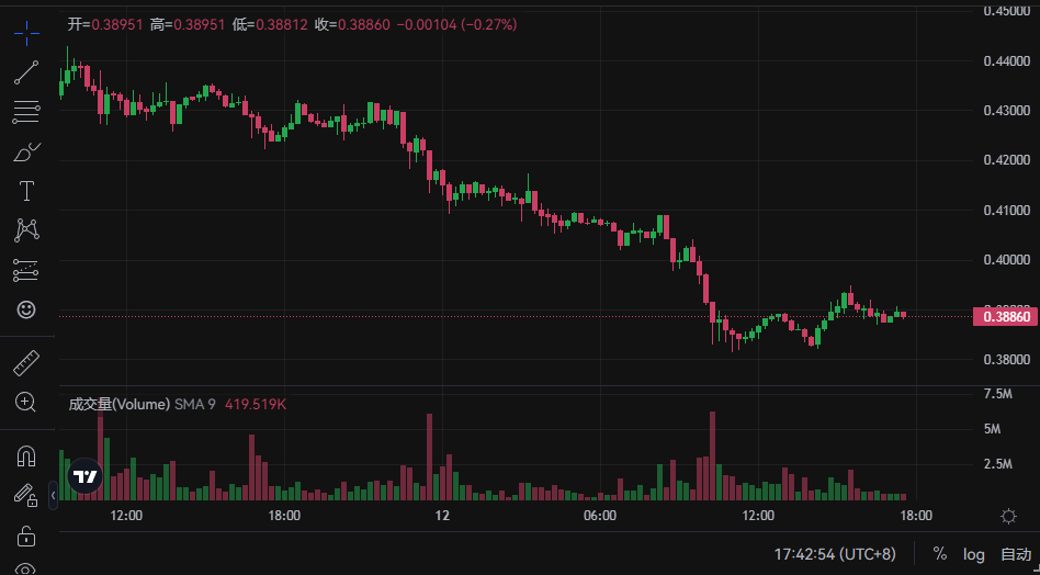 在此公告发布之际,据Tradingview数据,CFX价格自昨晚11时起大幅上涨,从0.37美元附近一路上冲至0.4477 美元高点,在9小时内**涨幅达21%,至截稿前,报0.4327美元,近24小时涨幅15%。