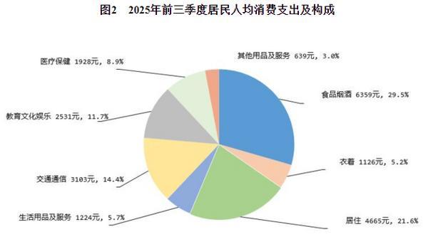 前三季度,**居民人均食品烟酒消费支出6359元,增长2.5%,占人均消费支出的比重为29.5%;人均衣着消费支出1126元,增长1.6%,占人均消费支出的比重为5.2%;人均居住消费支出4665元,增长2.3%,占人均消费支出的比重为21.6%;人均生活用品及服务消费支出1224元,增长9.6%,占人均消费支出的比重为5.7%;人均交通通信消费支出3103元,增长8.3%,占人均消费支出的比重为14.4%;人均教育文化娱乐消费支出2531元,增长10.3%,占人均消费支出的比重为11.7%;人均医疗保健消费支出1928元,增长1.5%,占人均消费支出的比重为8.9%;人均其他用品及服务消费支出639元,增长10.3%,占人均消费支出的比重为3.0%。