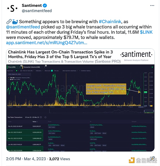 据Santiment数据,Chainlink似乎正在酝酿一些事情,Santiment 在周五的**几个小时,发现了3笔大的巨鲸交易,都是在11分钟内发生的。总共有1160万枚LINK被转移到巨鲸钱包,约7970万美元。