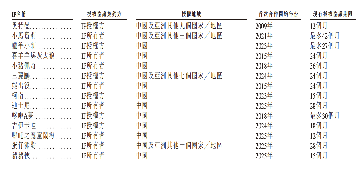 金添动漫表示,大部分IP趣玩食品是根据授权协议开发的,同时相当一部分的收入来自前五大授权IP相关的IP趣玩食品。于2022年至2024年,前五大授权IP贡献的收入占比分别为90%、88.7%、85.9%,2025年上半年为85.7%。其中,**授权IP奥特曼的收入占比于2023年**曾达63.0%,2025年上半年仍有43.9%。