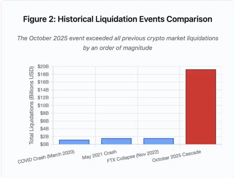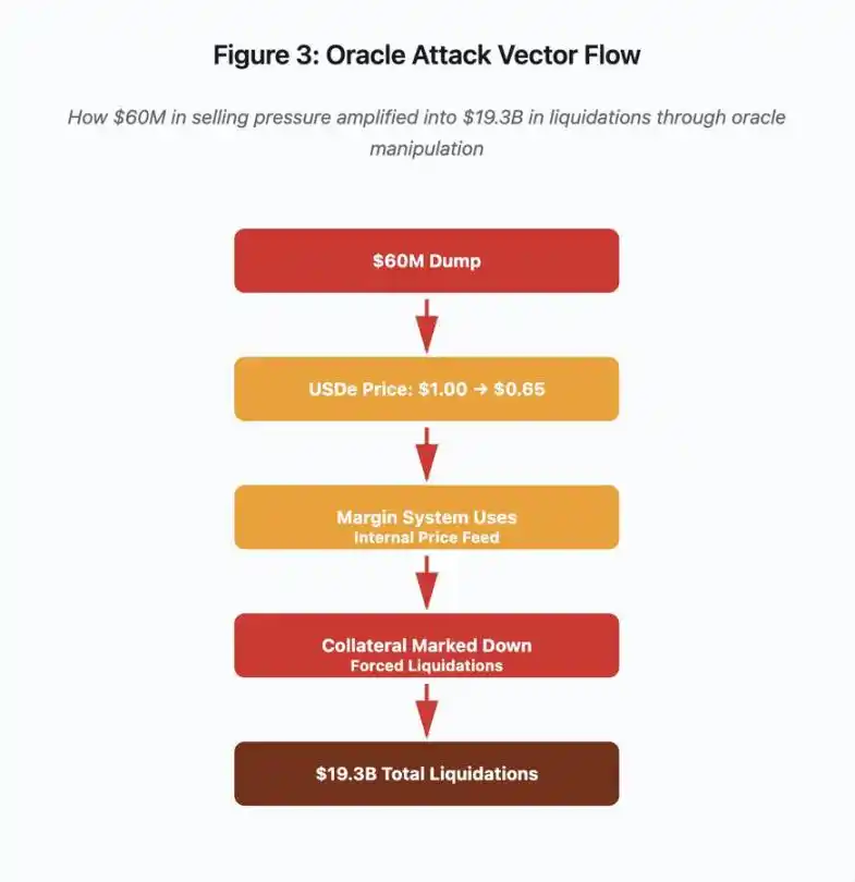这些清算迫使更多卖单进入同一非流动性市场,进一步压低价格。保证金系统观察到这些更低的价格,并标记了更多头寸的价值,反馈回路将 6000 万美元的抛售压力放大成了 193 亿美元的强制清算。