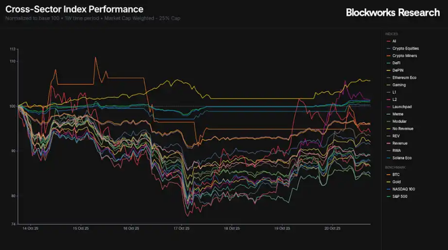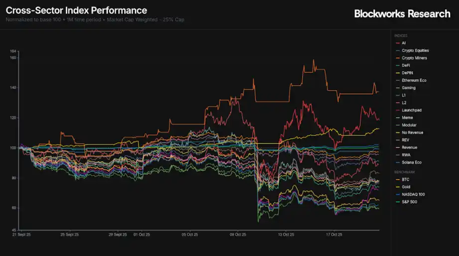 虽然短期显示一些上涨,但月线图显示几乎所有的加密货币指数在过去 30 天内都在下跌。10 月 10 日的清算事件导致了普遍的**,只有黄金、加密货币矿工、AI 和股票指数是表现强劲的领域。