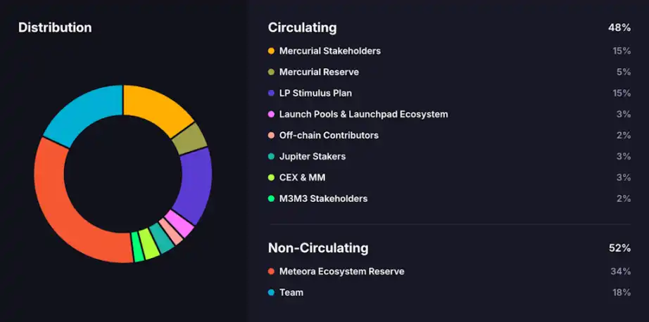 早在 2023 年,团队就宣布 20% 的 MET **将在 **E 时分发给 Mercurial 利益相关者。如下所示,团队信守了最初的承诺,其中 15% 分配给 Mercurial 利益相关者,5% 分配给 Mercurial 储备。此外该 DEX 自 2024 年 1 月 31 日起一直在运行一个积分计划,总共将分配 15% 的 MET 给该计划。在启动时,MET 供应量的 48% 将处于流通状态,与 Solana 生态系统中其他****发行相比,这是一个高流通比例。