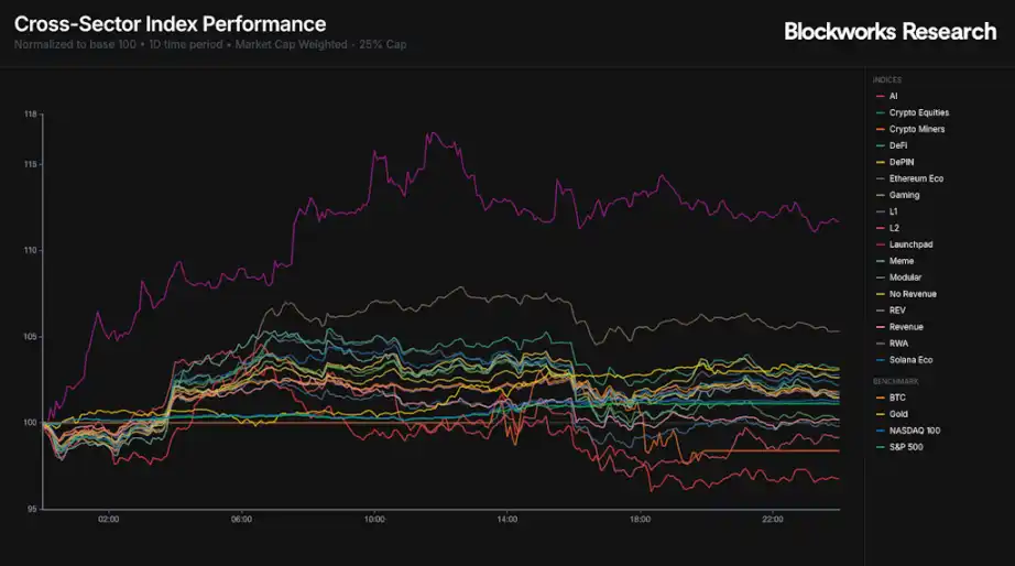 本周开局强劲,BTC 从上周五低点上涨了 7%。在周一的交易时段中,Launchpad 是表现**的板块,而 AI 板块跌幅**,扭转了各自在过去一周所展现的相对强弱态势。