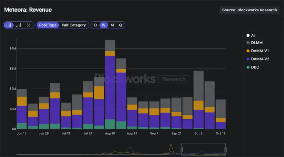 从整体财务数据来看,Meteora 在过去 30 天内从其所有资金池中产生了 880 万美元的收入,即使在链上活动相对较低的时期,每周收入也持续接近 150 万美元。值得注意的是,Meteora 超过 90% 的收入来自 Memecoin 资金池,这些池通常比 SOL- 稳定币、项目**、LST 和稳定币 - 稳定币池具有更高的费用**。