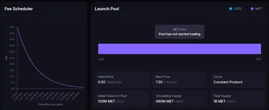 如前所述,总供应量的 10% 将用于通过动态 AMM 池引导初始流动性,起始价格为 0.5 美元,流动性分布范围直至 75 亿美元估值。早期流动性池是单边的,早期买家将用他们的 USDC 兑换 MET。请注意,池费用开始时很高,并通过费用调度程序随时间急剧下降。